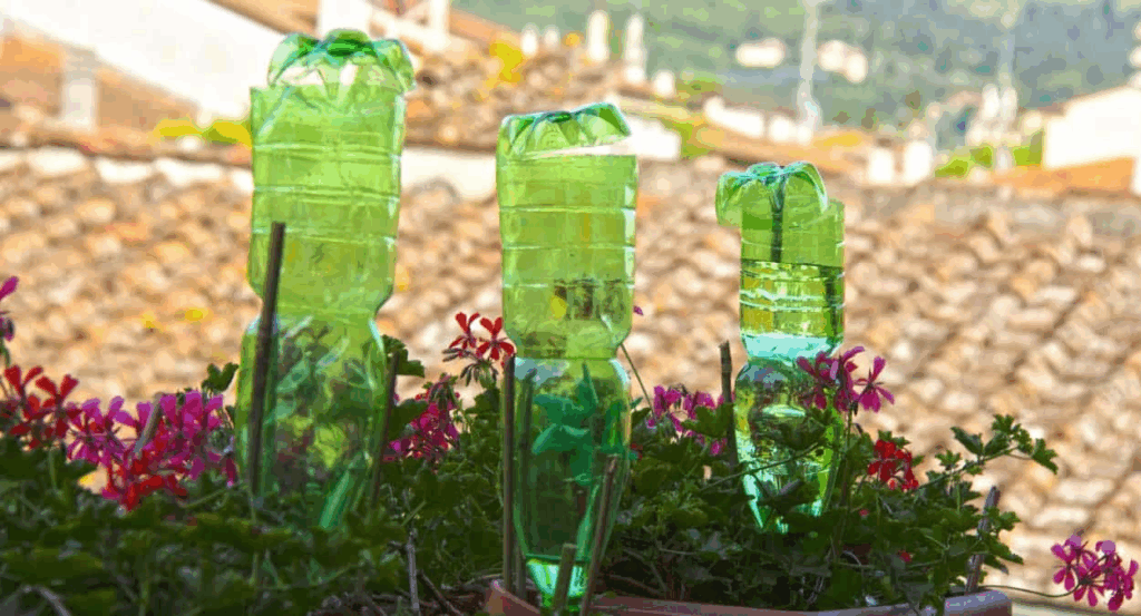 Cómo se arma: se llena una botella (1,5 o 2 L), se le hacen 1–3 agujeritos muy chicos en la tapa con una aguja caliente o alfiler (micro, no “agujero de clavo”), se entierra el pico hacia abajo cerca del borde de la maceta y se deja que haga goteo lento.