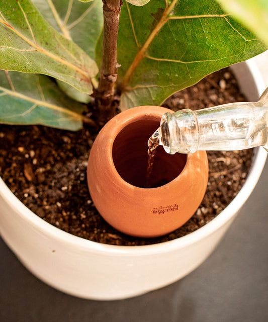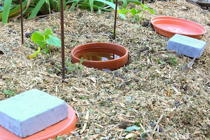 Este es un clásico de huerta y canteros: una olla/vasija de barro sin esmaltar enterrada cerca de las raíces. Es simple, súper estable y ahorra agua.