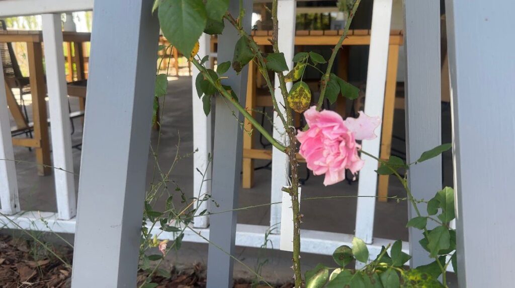 Empezamos la recorrida en la zona del restaurante. Daniel nos explicó cómo fue diseñando los canteros que abrazan la terraza del resto, creando una transición suave entre la arquitectura y el campo. En esta etapa, sumó la mirada experta de la rosicultora Agustina Hilbert, quien asesoró en la elección de rosales con tutores que visten el espacio, aportando esa sofisticación clásica que el mundo del vino requiere, pero con una vuelta de tuerca contemporánea.