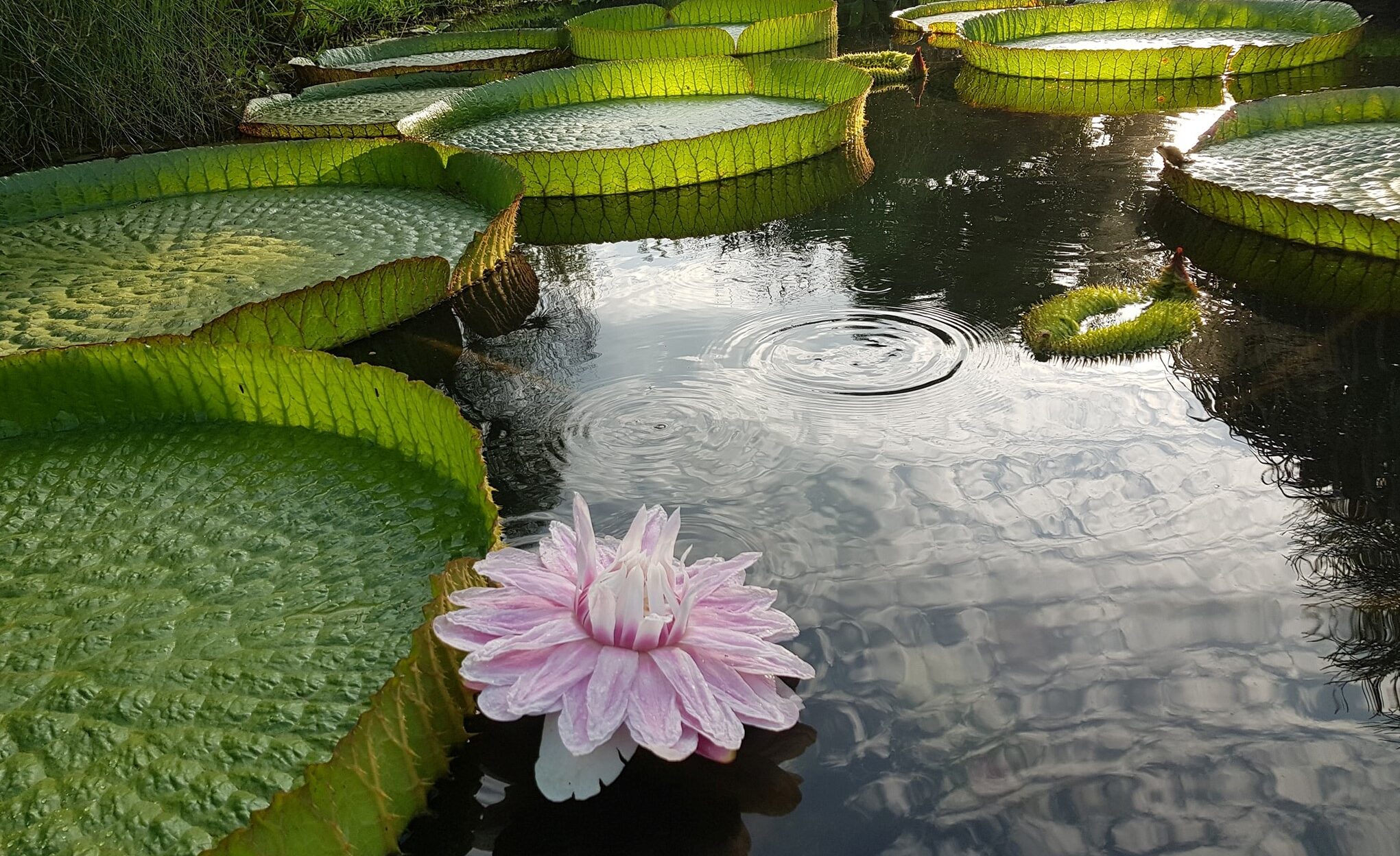 Es una de las flores acuáticas más emblemáticas del Litoral, conocida por sus enormes hojas flotantes -capaces de sostener varios kilos- y por su floración mágica y efímera.