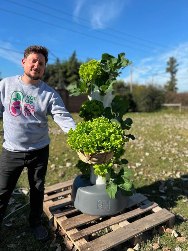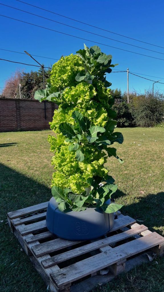 Uno de los sistemas que más nos llamó la atención fue la torre vertical. Es un formato ideal para combinar producción y estética. Analía Puerta nos explicó que este sistema permite armar una “huerta jardín”, mezclando hortalizas con flores en una estructura que aprovecha la altura. Lo que más sorprende es la velocidad: vimos un tomate con apenas un mes y medio de desarrollo que ya mostraba un crecimiento tremendo.