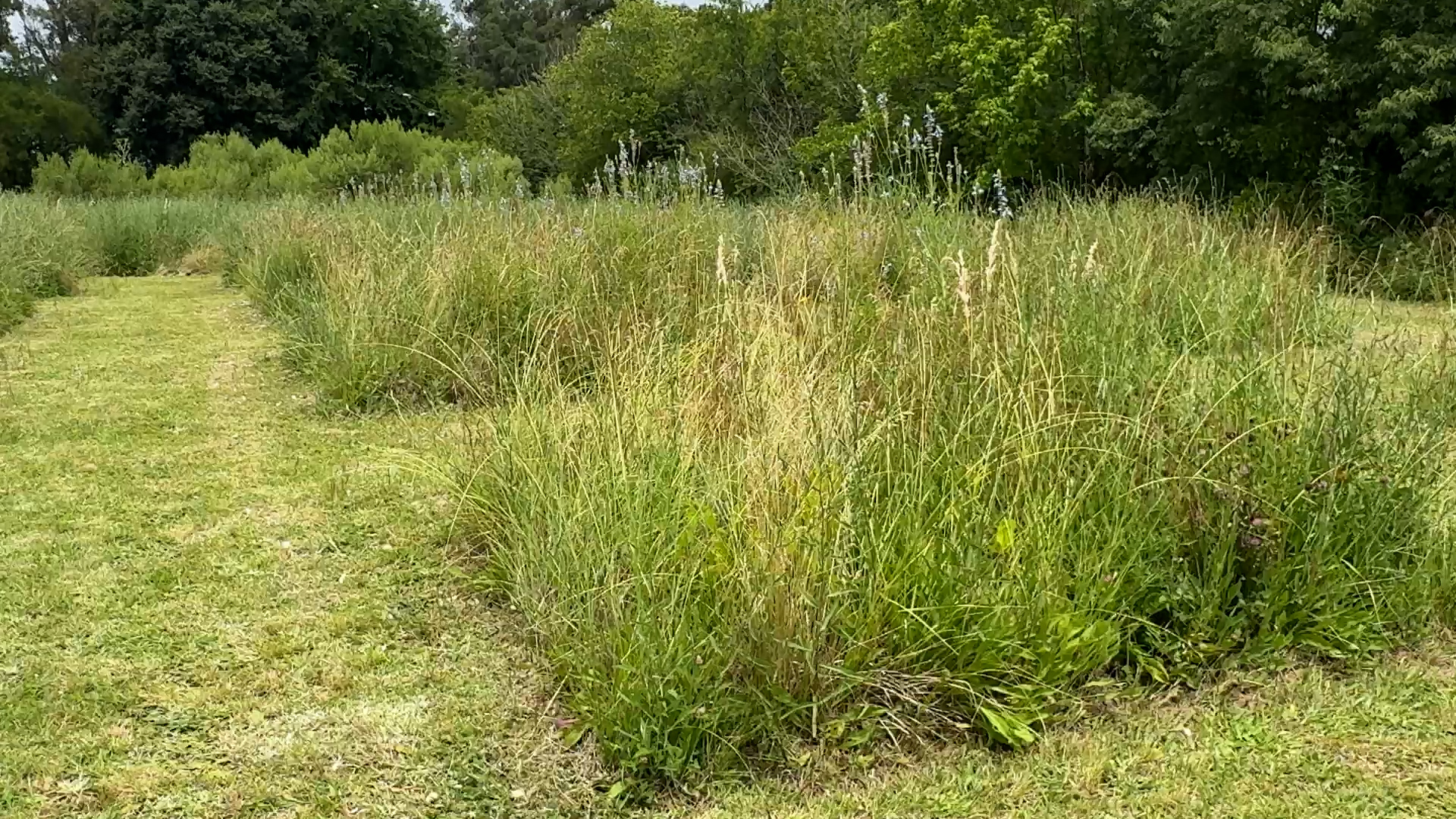 Lo primero que nos voló la cabeza fueron los ensayos de praderas de la ingeniera Verónica Bugallo. Imaginate esto: plantas nativas que desde el 2020 están ahí, a puro coraje, sin riego, sin cortes y sin limpieza. Conviven con lo que sale de la tierra y el resultado es increíble. Lo que buscan es identificar esas “todoterreno” que mantienen la belleza con el mínimo mantenimiento y, de paso, invitan a toda la biodiversidad a quedarse a vivir en el jardín.
