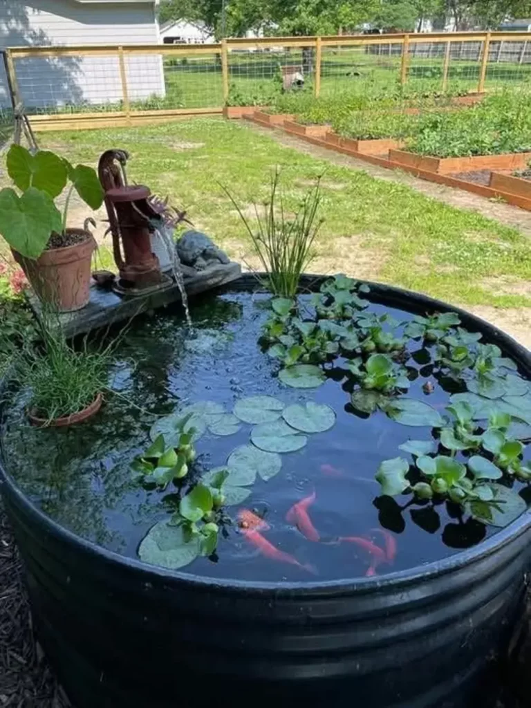 Este tipo de estanques en contenedor funcionan muy bien en patios urbanos porque permiten controlar mejor el volumen de agua y el mantenimiento.