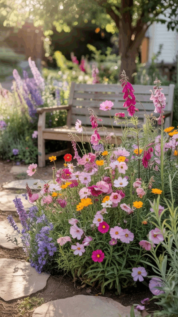 - Cosmos (C. bipinnatus): livianos, altos y ultra rústicos. Van a pleno sol y tierra pobre; cuanto menos mimo, mejor florecen.